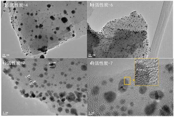 為了進(jìn)一步研究金顆粒在活性炭表面的分布和結(jié)晶度,我們拍攝了鍍金活性炭樣品的透射電子顯微鏡圖像。圖7顯示了各種活性炭樣品在不同放大倍數(shù)下的TEM圖像。圖2a、b顯示了金納米粒子在活性炭表面上的分布。很明顯,兩個(gè)樣本的分布是均勻的。活性炭-4和活性炭-6似乎都以類似的方式相互作用和承載金納米粒子;钚蕴-7樣品的高分辨率TEM圖像如圖2c、d所示。圖2c顯示大多數(shù)金納米顆粒很小,直徑為3-5nm,并且只能看到少數(shù)團(tuán)聚顆粒。圖2d顯示了金的晶格條紋間距。發(fā)現(xiàn)晶格條紋間距為0.217nm,對應(yīng)于金晶面的面。此外,我們試圖通過TEM圖像估計(jì)顆粒尺寸的分布,我們發(fā)現(xiàn)所有樣品中超過80%的金顆粒的尺寸小于5nm。