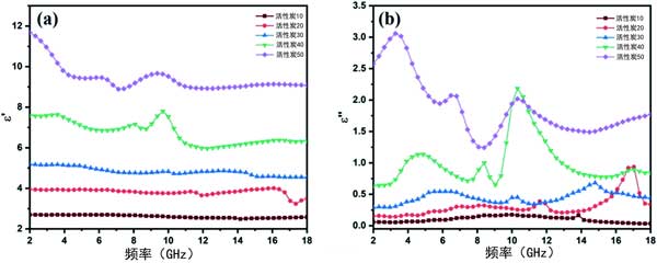 為了研究的吸收的微波吸收特性,這兩個(gè)重要參數(shù),即εr和μr從矢量網(wǎng)絡(luò)分析儀獲得。由于二硫化鉬和活性炭都是非磁性材料,因此μr的值取為1。εr由兩部分組成:介電常數(shù)的實(shí)部代表能量的儲(chǔ)存,而虛部的介電常數(shù)介電常數(shù)表示能量耗散。所有樣品的ε值隨著頻率的增加呈下降趨勢(shì),波動(dòng)較小,如圖3a所示。炭10、炭20、炭30、炭40和炭50的ε值分別在2.69-2.57、3.95-3.49、5.19-4.54、7.58-6.33和11.68-9.08的范圍內(nèi)。ε的值隨著石蠟中載鉬活性炭濃度的增加而增加,根據(jù)有效介質(zhì)理論,并且石蠟中載鉬活性炭的增加導(dǎo)致界面極化的增加。石蠟基質(zhì)內(nèi)的多個(gè)界面由活性炭的多孔結(jié)構(gòu)和二硫化鉬產(chǎn)生納米粒子,放大界面極化。因此,隨著填料二硫化鉬負(fù)載的增加,ε的值將明顯增加。
