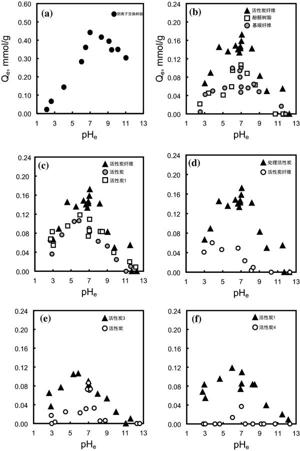 活性炭的陰離子吸附能力通常受溶液pH值的影響。因此,我們使用吸附實驗數(shù)據(jù)評估了所有pH范圍內砷的潛在吸附位點。pH2-12吸附容量的結果如圖1所示。所有樣品在pH7附近表現(xiàn)出高吸附能力。通常,酸性pH條件下的陰離子吸附能力取決于堿性官能團的數(shù)量。作為基本官能團的例子,石墨烯層上的π電子可以吸引一些質子,導致吸附位點略有增加。此外,吡啶氮(N-6)、吡咯氮(N-5)和胺基團在低于特定pH值時會變成帶正電荷的吸附位點,這取決于它們的酸度系數(shù),而季氮始終以帶正電的形式存在。因此,當這些位點根據(jù)它們的酸度系數(shù)在某些酸性pH范圍內變成正電荷時,它們可以充當陰離子吸附位點。由于這個原因,碳的活化在酸性pH值而不是堿性pH值條件下表現(xiàn)出相對較高的砷吸附能力。然而,H3AsO4的酸度系數(shù)值為2.19、6.94和11.5。例如,砷酸鹽的主要種類是H3AsO4和H2AsO4-在pH值2.19。因此,當溶液pH值低于2時,砷的主要種類變?yōu)橹行浴;钚蕴亢捅晃轿镏g的靜電相互作用變得排斥。此外,由于用鹽酸調節(jié)pH,砷酸鹽和氯離子之間的競爭會抑制砷酸鹽的吸附。相反,砷的主要種類是堿性pH范圍內的陰離子。然而,當溶液的堿度大于每個樣品的pHpzc時,碳表面帶負電荷。這些強堿性條件在靜電上不適合陰離子吸附。此外,過量的氫氧根離子也在堿性區(qū)域中充當強競爭離子。綜上所述,陰離子吸附在堿性pH范圍內是不利的。