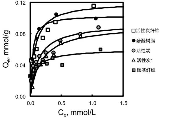 我們在圖2中顯示了連續(xù)加熱處理活性炭的朗繆爾吸附等溫線。由于顯示出大吸附容量的pH值較窄,因此我們將平衡pH條件確定為pH6.6-7.0。在此范圍內,大多數(shù)經CVD處理的樣品顯示出穩(wěn)定的吸附能力。決定系數(shù)指出朗繆爾等溫線與所有樣品的合適匹配。因此,該結果表明砷吸附可以發(fā)生在單層上?傊摻Y果支持了砷酸鹽吸附發(fā)生在NQ位點、石墨烯層上的π電子質子化以及活性炭的含氧和氮的基本官能團質子化的想法。