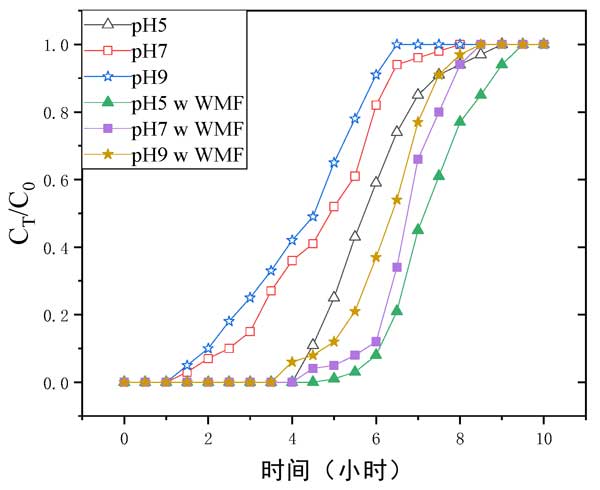 圖2:不同pH值下鐵改性活性炭介導(dǎo)去除銻(III)的突破曲線。
