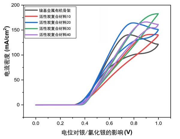 通過(guò)在KOH和CH3OH中氧化甲醇,使用循環(huán)伏安法測(cè)試活性炭復(fù)合材料的電化學(xué)性能。具有活性炭復(fù)合材料的鎳金屬對(duì)甲醇氧化反應(yīng)表現(xiàn)出更高的催化活性(見圖2)。在鎳金屬改性玻璃碳電極的情況下,峰值電流密度沒(méi)有添加活性炭的高。具有更高濃度活性炭(40mg)的樣品顯示出高峰值電流密度。隨著活性炭量(60mg)的進(jìn)一步增加,峰值電流密度降會(huì)稍微降低。綜上所述,建議將活性炭的濃度增加到一定限度可以提高電流密度。然而,增加活性炭的濃度也可能對(duì)催化活性產(chǎn)生不良后果。此外,活性炭復(fù)合材料的CV曲線具有不同的形狀和峰位置,這是因?yàn)楹铣蓵r(shí)活性炭分散不完全,也由于其大量使用導(dǎo)致催化劑發(fā)生簇集,導(dǎo)致覆蓋金屬有機(jī)框架表面,從而阻礙活性催化位點(diǎn)在低電位下進(jìn)行反應(yīng),從而在高電位下發(fā)生電荷轉(zhuǎn)移。