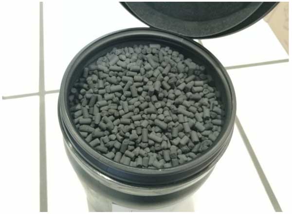 根據(jù)直接使用瓶裝真實(shí)氣體所獲得的結(jié)果,包括列出的催化劑毒物,這會導(dǎo)致催化劑快速降解,因此在第一個反應(yīng)器的上游安裝了活性炭過濾器。為此,將金屬氧化物浸漬的活性炭顆粒添加到氣體混合站。這些顆粒專門開發(fā)用于從缺氧氣流(例如CO2、N2、CO和H2)中去除硫化氫、有機(jī)硫醇、二氧化硫、硫化羰和氮氧化物。它們的銅含量為7%(以CuO計),直徑為3mm,長度為7mm(圖3)。將總共約300毫升的這些顆;钚蕴考尤霘怏w混合站。