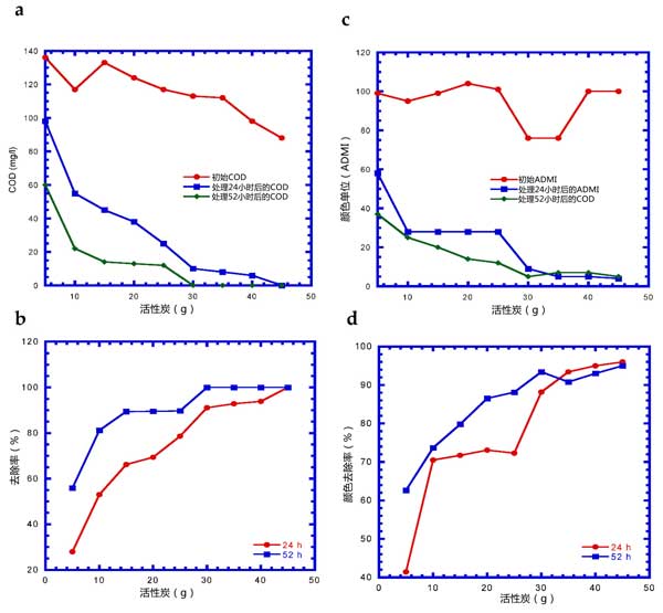 不同活性炭用量在24和54小時后COD和ADMI的變化如圖2所示。在初始COD濃度為88-136mg/L的情況下,分別通過吸附染料廢水24和52小時來完全去除COD需要45和30g的活性炭用量(圖2ab)。ADMI的降低和去除趨勢隨活性炭用量24和52小時的變化與COD變化相似(圖2)。ADMI隨著活性炭用量的增加而降低;钚蕴课24小時和52小時后,殘留ADMI分別為4-5和5-7。隨著活性炭用量≥30g,ADMI的去除效率從88-96%提高到90-95%。