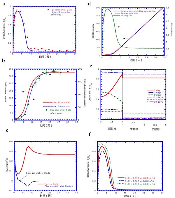 圖3:實驗結(jié)果和模型模擬(a)COD流出物,(b)生物質(zhì)生長,(c)流入生物膜和活性炭的通量,(d)COD去除,(e)COD曲線,和(f)COD流出物各種有機負載率(OLR)。