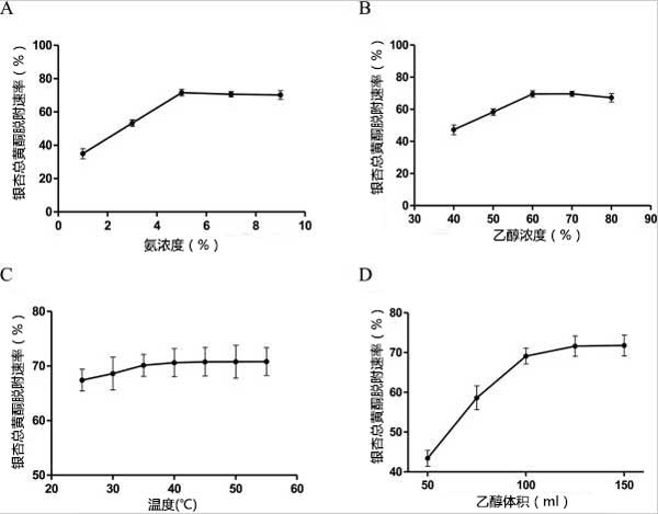 活性炭對銀杏葉中銀杏總黃酮的吸附主要依靠分子間范德華力的可逆吸附和表面酸性氧化物的不可逆吸附,兩者在吸附極性化合物方面均優(yōu)于非極性化合物。銀杏總黃酮的解吸方法主要有升溫解吸(沸水)、置換解吸(苯酚、氨水或CaCl2)和超聲波解吸。沸水對銀杏總黃酮的穩(wěn)定性影響很大,氨水的效果與幾種去污劑相比效果顯著。因此,本研究將通過單因素優(yōu)化相關(guān)因素。單因素優(yōu)化比較了三種拆分劑(苯酚、氨水或CaCl2)對活性炭中銀杏總黃酮拆分的影響,其中氨水的影響最為顯著。因此,我們比較了不同濃度氨對活性炭解析的洗脫速率,氨濃度在5%時達(dá)到最大值,超過5%后逐漸下降。由于黃酮類化合物的極性范圍較寬,在大約5%的氨-乙醇-水溶液中可以實(shí)現(xiàn)銀杏總黃酮的最大解吸率(71.2%)。