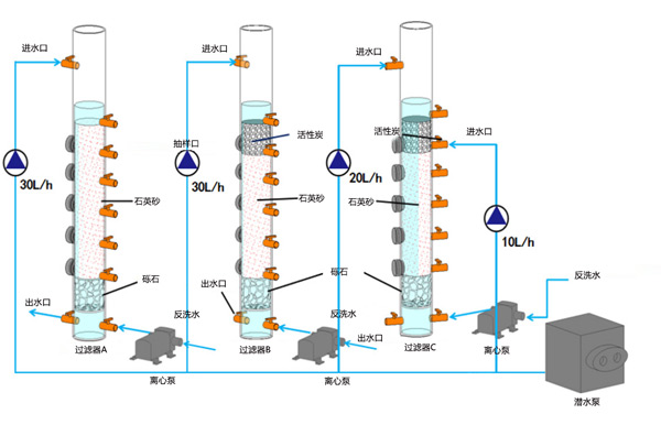試驗(yàn)裝置如圖1所示,主體結(jié)構(gòu)采用有機(jī)玻璃制成,內(nèi)徑70mm,高度2000mm。過濾器包括進(jìn)水管、出水管、反沖洗水管、支撐層和過濾介質(zhì)層。200毫米高的支撐層由礫石制成。粒徑為0.5-1mm,和分別為1-2mm,過濾層的填料為石英砂和椰殼活性炭。過濾器A的填料層為1000mm石英砂。過濾器B、C的填料層均為上層200mm椰殼活性炭和下層800mm石英砂。根據(jù)水廠的設(shè)計(jì)規(guī)范,過濾器的過濾速度為8m/h,進(jìn)水流量為30L/h。過濾器A和B為單點(diǎn)進(jìn)水,過濾器C為兩點(diǎn)進(jìn)水,兩個(gè)進(jìn)水點(diǎn)分別位于過濾器頂部和20cm深度處;第一進(jìn)水點(diǎn)流量為20L/h,第二進(jìn)水點(diǎn)流量為10L/h。過濾器A和B是過濾器C的空白對(duì)照。過濾器每24小時(shí)反洗一次。