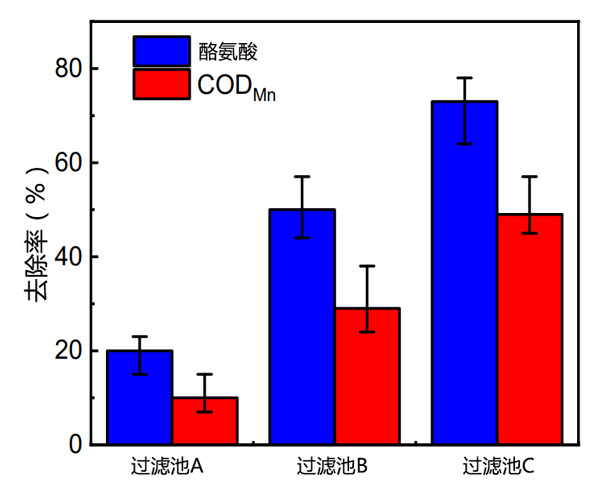 活性炭濾池出水二氯乙腈前體酪氨酸和CODMn的平均去除率如圖2所示。實(shí)驗(yàn)過程中,三個(gè)活性炭過濾器出水酪氨酸濃度依次下降:過濾器C(73%)>過濾器B(50%)>過濾器A(20%)(p<0.05)。生物濾池出水的酪氨酸濃度低于進(jìn)水。誰記錄了飲用水處理廠生物過濾后出水中DON濃度的增加,表明DON總體出水濃度的變化并不代表個(gè)體的變化,而是過濾器中不同個(gè)體的變化規(guī)律也不同。平均出水CODMn去除率的變化趨勢與平均出水酪氨酸去除率一致。CODMn去除率可以反映生物濾池中有機(jī)物的去除情況。酪氨酸是一種有機(jī)物,其分子結(jié)構(gòu)中含有還原性酚羥基和氨基,可被高錳酸鉀氧化。因此,CODMn去除率也可以作為酪氨酸去除的依據(jù)。