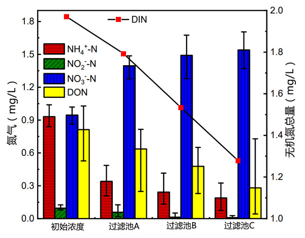 飲用原水中的氮主要以NH4+-N、NO2-N、NO3N和有機(jī)氮的形式存在。本實(shí)驗(yàn)中的大部分有機(jī)氮是酪氨酸。在生物濾池中,溶解無機(jī)氮(DIN)和DON是相互轉(zhuǎn)化的,因此有必要討論活性炭濾池中向氮的轉(zhuǎn)化。進(jìn)出活性炭濾池的水中氮的變化如圖3所示。溶解無機(jī)氮損失為活性炭濾池C>B>A(p<0.05),與CODMn的去除率一致。過濾器對(duì)有機(jī)物的利用隨著溶解無機(jī)氮損失的增加而增加,表明反應(yīng)中的溶解無機(jī)氮損失現(xiàn)象與過濾器反硝化有關(guān)。