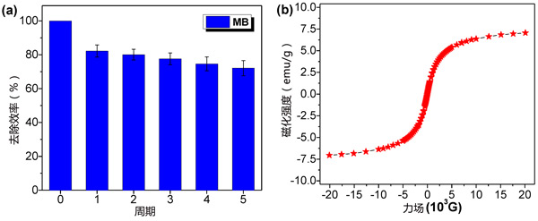 首先,研究了活性炭含量對磁性吸附劑吸附能力的影響。為了比較,活性炭的吸附容量也在相同條件下確定。在較高的初始染料濃度(5.0mM)下,磁性活性炭對MB和MO的飽和吸附能力明顯增加,隨著活性炭含量的增加。但是對于實(shí)際的吸附應(yīng)用,非常需要具有良好可重復(fù)使用性的吸附劑。我們通過使用乙醇作為洗脫劑來評估吸附MB的磁性活性炭的可重復(fù)使用性。如圖3a所示,解吸的磁性活性炭的去除效率隨著重復(fù)使用次數(shù)的增加而降低。與原來的去除效率相比,經(jīng)過5個解吸-吸附循環(huán)后,去除效率保持在72.1%左右。盡管如此,再生的活性炭的吸附能力仍然比較高,高于傳統(tǒng)的磁性吸附劑。此外,即使經(jīng)過5次再生吸附循環(huán)后,磁性活性炭仍表現(xiàn)出與新制備的相似的飽和磁化強(qiáng)度值(圖3b),表明這次的新型吸附劑具有良好的結(jié)構(gòu)穩(wěn)定性。