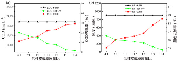 圖1:活性炭載鋁質(zhì)量比對(a)COD和(b)2小時色度去除的影響。