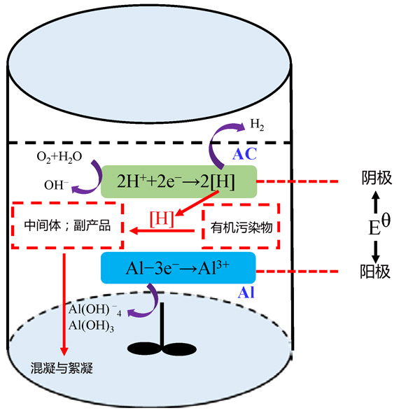 根據(jù)實際工況,提出了一種可行的活性炭載鋁微電解工藝分解水生環(huán)境中有機污染物的反應機理(圖2)。由于其高吸附容量和電導率,活性炭被用作陰極保護。在陽極(鋁廢料),由鋁提供的電子通過微型原電池轉(zhuǎn)移到陰極(活性炭),吸附在陰極表面的有機污染物受到這些釋放的電子的攻擊。水電離產(chǎn)生的H+在陰極獲得電子并產(chǎn)生具有強化學反應性的活性氫[H]或H2,和活性氫[H]·可以部分降解有機污染物。此外,Al失去三個電子形成鋁離子(Al3+)。然后,鋁離子沉淀形成氫氧化鋁(Al(OH)3、Al(OH)-4等)。作為有利的絮凝劑,這些氫氧化鋁可以有效去除廢水中的有機污染物。難降解污染物在活性炭載鋁微電解工藝的輔助下被分解為小分子中間體,也可以通過氫氧化鋁絮狀污泥的絮凝共沉淀來消除。換言之,與活性炭載鋁微電解工藝相關的許多協(xié)同效應可以有效地分解水環(huán)境中的有機污染物。