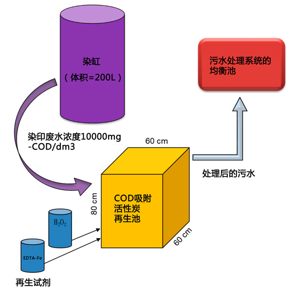 根據(jù)獲得的數(shù)據(jù)和當(dāng)前的紗線染色工藝,使用所提出的兩步處理系統(tǒng)處理來自常用的200L染浴的高COD染色廢水看起來適用,并提出了建議如圖3所示。據(jù)我們所知,目前運營的染色設(shè)施中沒有這種建議的設(shè)置。設(shè)計容積(即200L)足以容納一批染缸出水,使高COD廢水可直接進(jìn)入擬建裝置的吸附和再生。根據(jù)結(jié)果,去除50-60%的COD將大大減少回流到平衡罐的COD,從而避免現(xiàn)有廠內(nèi)生物處理單元的過載情況。為了運行所提議的裝置,首先,將來自染色池的一定量的高COD廢水引導(dǎo)至充滿指定活性炭的反應(yīng)單元(如果處理120L廢水,則為20kg)進(jìn)行24小時吸附。由于結(jié)果表明染浴出水COD在酸性pH值下吸附更多,二是對處理后的廢水進(jìn)行篩分,24小時后排至其廢水處理設(shè)施的頭部(即平衡池)。第三,分別串聯(lián)添加初始濃度為2.12mmol/dm3和2.5%的乙二胺四乙酸鐵鈉和過氧化氫,以啟動活性炭再生1小時。從連續(xù)運行來看,兩步法處理高COD染色廢水的應(yīng)用前景看好。然而,我們確實注意到該技術(shù)的當(dāng)前應(yīng)用可能僅限于染浴設(shè)計及其操作。染浴的高COD流出物發(fā)生在染色過程的第一次排放,但對于大多數(shù)可用的染浴操作,根據(jù)不同的COD濃度對每批流出物進(jìn)行分離是不適用的。一些染色裝置或染色工藝的改造被認(rèn)為是必要的。