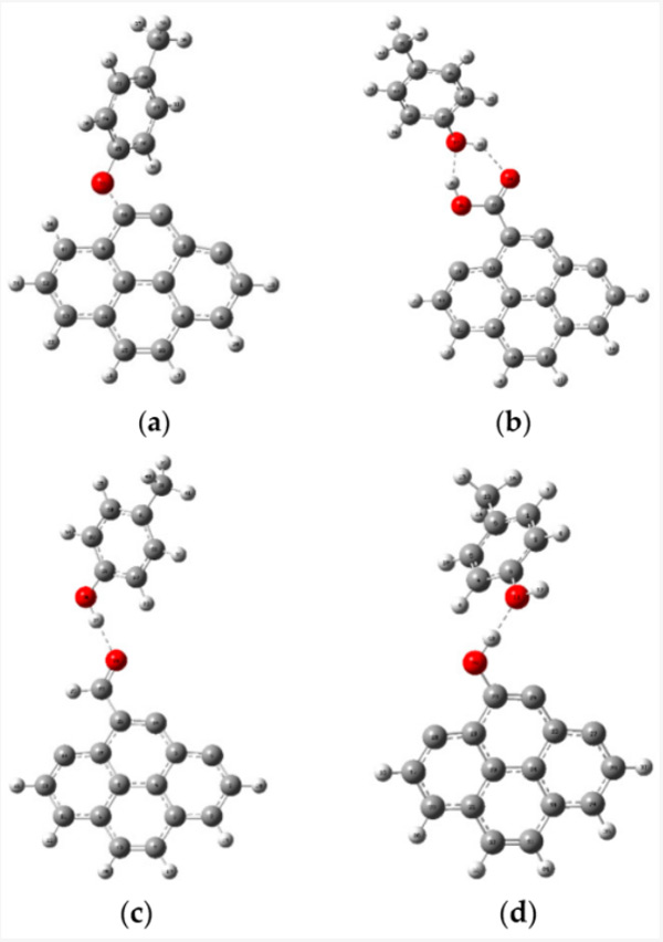 預(yù)計(jì)甲酚在活性炭上的吸附將通過各種類型的相互作用進(jìn)行,例如電子供體-受體機(jī)制、靜電相互作用、π-π相互作用和氫鍵形成。然而,在各種類型的相互作用中,活性炭和被吸附物之間的氫鍵是有助于吸附過程的重要相互作用類型之一。因此,在本研究中,使用DFT方法研究了對(duì)甲酚和活性炭之間的氫鍵相互作用?紤]到它們之間的氫鍵,研究了對(duì)甲酚與原始活性炭和功能化活性炭的相互作用。圖1代表各種相互作用的優(yōu)化結(jié)構(gòu)。