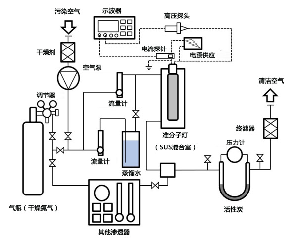 使用動(dòng)態(tài)吸附實(shí)驗(yàn)進(jìn)行臭氧催化氧化的表征。動(dòng)態(tài)吸附的實(shí)驗(yàn)裝置如圖2所示。臭氧氣體和二甲硫氣體的混合物流入浸漬的活性炭。通過驅(qū)動(dòng)準(zhǔn)分子燈產(chǎn)生臭氧,2.1L/分鐘的室內(nèi)空氣流入SUS室。臭氧濃度由放電功率控制。二甲硫是通過將0.2L/分鐘的干燥空氣流到氣體滲透器而產(chǎn)生的。使用氣體檢測(cè)管測(cè)量出口二甲硫濃度,測(cè)定了突破時(shí)間對(duì)臭氧添加量的依賴性,并研究了臭氧量?jī)?yōu)化。