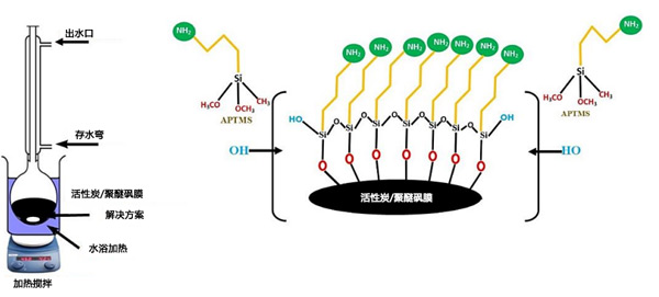 為了改性活性炭的表面,將15g非常細(xì)的干燥活性炭粉末與300mL甲苯和2mL氨丙基三甲氧基硅烷(APTMS)溶液在磁力攪拌下在40℃惰性環(huán)境下混合24小時(shí)。圖1表示實(shí)驗(yàn)裝置的示意圖。使用實(shí)驗(yàn)室旋轉(zhuǎn)蒸發(fā)儀去除溶劑。用甲苯和丙酮進(jìn)一步洗滌所得的APTMS活性炭,然后在60℃下真空干燥6小時(shí)。這種干燥的活性炭被稱(chēng)為改性活性炭,由表面上的胺官能團(tuán)組成。改性活性炭在干燥條件下儲(chǔ)存以用于后續(xù)的實(shí)驗(yàn)工作。