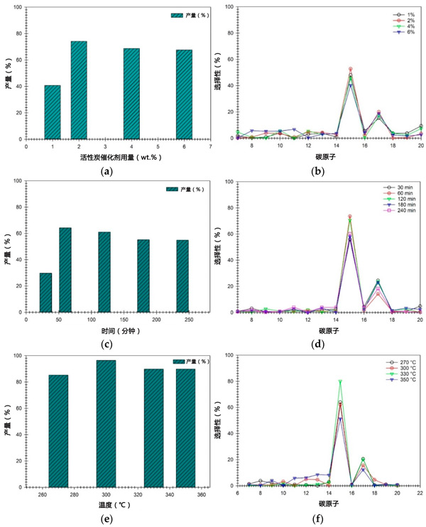 活性炭催化劑負(fù)載對(duì)烴類轉(zhuǎn)化和產(chǎn)物分化的影響如圖3a、b所示。脫氧反應(yīng)在惰性N2氣氛中在300℃的反應(yīng)溫度和500rpm的攪拌速度下進(jìn)行30分鐘。評(píng)估了催化劑負(fù)載量(即1-6wt.%)的影響。數(shù)據(jù)表明,脫氧性能和分化均在1-2wt.%的活性炭催化劑負(fù)載范圍內(nèi)升高,但隨后在催化劑負(fù)載>2wt.%后下降。產(chǎn)率和產(chǎn)物選擇性當(dāng)使用2wt.%時(shí),其效果更好,即分別為47.13%和72.85%。相反,在催化劑負(fù)載量超過2wt.%時(shí),脫氧性能和選擇性的下降可能反映了催化劑的負(fù)載過重,由于不同的活性位點(diǎn)的剩余活性位點(diǎn),這將促進(jìn)對(duì)二級(jí)和并行反應(yīng)的驅(qū)動(dòng)。