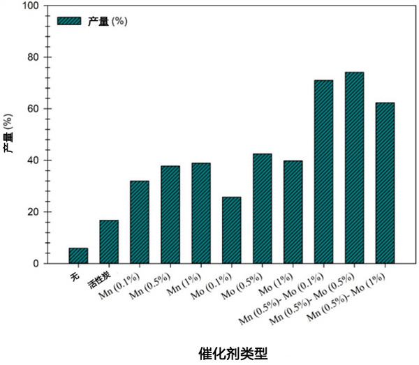 當(dāng)廢油對(duì)Mn/活性炭和Mn-Mo/活性炭催化劑樣品進(jìn)行脫氧反應(yīng)時(shí),產(chǎn)物包括液態(tài)正烷烴和烯烴,以及含氧中間體物質(zhì),例如醇,醛和酮,以及汽化的CO和CO2。單獨(dú)或兩種活性炭金屬催化劑生產(chǎn)提供了優(yōu)異的轉(zhuǎn)化和完全差異化在廢油的溶解氧過程;钚蕴看呋瘎┑姆磻(yīng)性能主要取決于Mn和Mo表面密度以及催化劑的酸度。脫氧反應(yīng)在300℃的反應(yīng)溫度和500rpm的攪拌速度下在惰性N2中進(jìn)行30分鐘氣氛。對(duì)活性炭上Mn和Mo負(fù)載百分比的篩選表明,與0.1wt.%相比,將活性炭負(fù)載0.5wt.%將烴產(chǎn)率從31.9%提高到37.9%,并將Mo負(fù)載量從0.1wt.%提高至0.5wt.%導(dǎo)致產(chǎn)率從25.7%增加到42.4%。篩選結(jié)果表明,最佳的錳負(fù)載百分比為0.5wt.%,并選擇了此百分比。Mo對(duì)Mn催化劑的影響從0.1到1wt.%負(fù)載百分比進(jìn)行了研究,結(jié)果表明0.5wt.%的Mn和Mo是合適百分比,烴收率為74%(圖2)。
