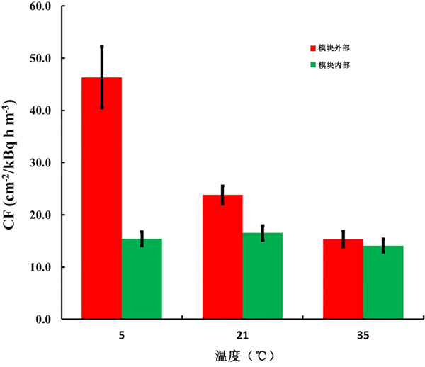 對于實(shí)驗(yàn),使用三種活性炭的織物為探測器設(shè)計了單獨(dú)的模塊。對于前兩種活性炭,模塊是HDPE,對于第三種活性炭,模塊是LDPE。單獨(dú)設(shè)計遵循上述方法,考慮到每種活性炭織物的確切單獨(dú)質(zhì)量。在所有設(shè)計中,不同溫度下的k(T)值根據(jù)方程式計算;钚蕴康慕Y(jié)果如圖2所示。5℃時的CF0比35℃時的CF0高305%。相比之下,對于放置在補(bǔ)償模塊中的傳感器,CF的變化在17%以內(nèi)(最大值/最小值=1.17)。值得注意的是,在模塊內(nèi)部不同溫度下暴露的傳感器的CF之間的配差異在95%的顯著性水平上沒有統(tǒng)計學(xué)意義。發(fā)現(xiàn)所描述的帶有補(bǔ)償模塊的探測器的CF明顯高于其他常用的無源氡探測器。