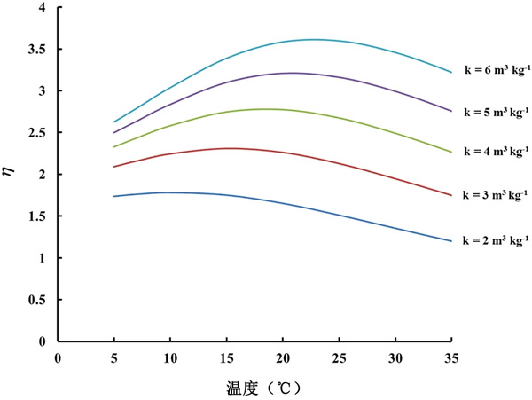 查看活性炭的檢測器的結(jié)果(圖2)可以看出,相同溫度下的CF0在活性炭之間存在差異。這意味著不同活性炭的吸附能力存在一些差異。在所有模塊設(shè)計中,假設(shè)21℃下的吸附容量值為4m3/kg-1。然而,由于我們的實(shí)驗(yàn)結(jié)果表明不同活性炭材料的k可能存在差異。不同k值的結(jié)果如圖3所示?梢钥闯觯瑢τ趨^(qū)間2-6m3/kg-1內(nèi)的所有k值,η的變化(例如最大/最小比率)與溫度的變化遠(yuǎn)小于未包裝傳感器觀察到的230-305%的變化。