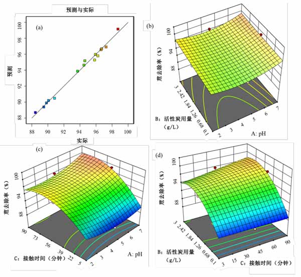 圖2:(a)預(yù)測(cè)的乙腈去除量與實(shí)際去除量的關(guān)系圖,(b)乙腈去除量的pH值與活性炭用量的3D圖,(c)乙腈去除量的pH值與接觸時(shí)間的3D圖,(d)3D圖接觸時(shí)間與活性炭用量的苊去除圖。