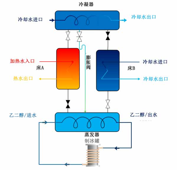 吸附制冰系統(tǒng)的兩床配置來(lái)檢查使用50%活性炭、10%聚乙烯醇和40%石墨烯納米片的復(fù)合吸附劑。制冰可以通過(guò)循環(huán)乙二醇來(lái)完成,乙二醇在-2℃下進(jìn)入吸附制冷的蒸發(fā)器,并帶有外部制冰塊,如圖1所示。復(fù)合活性炭吸附劑應(yīng)用于吸附床中普通銅管的外表面上,加熱和冷卻流體被泵入管內(nèi)。加熱和冷卻水在四個(gè)過(guò)程(預(yù)熱、解吸、預(yù)冷和吸附)之間在兩個(gè)床之間切換,完成一個(gè)床循環(huán)。根據(jù)操作模式,切換閥用于將蒸發(fā)器和冷凝器與吸附床連接起來(lái)。