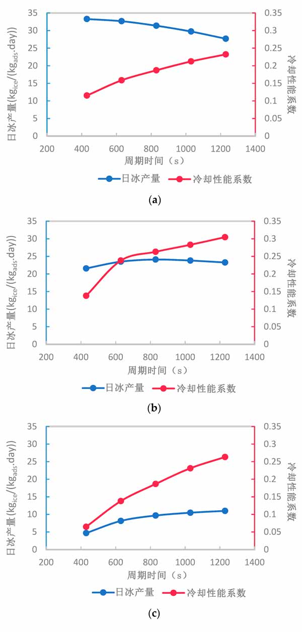 圖4:不同循環(huán)時(shí)間和(a)2mm、(b)5mm、(c)10mm活性炭復(fù)合材料厚度下系統(tǒng)的具體日冰產(chǎn)量和性能系數(shù)。