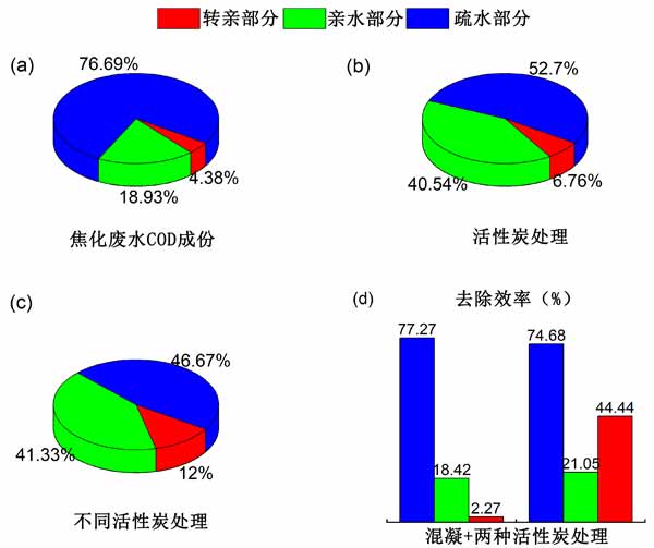 圖1:(a)焦化廢水中溶解有機(jī)物組合的比例(b、c)混凝和活性炭處理后溶解有機(jī)物組合的比例(d)混凝聯(lián)合活性炭處理對溶解有機(jī)物組合的去除效率。