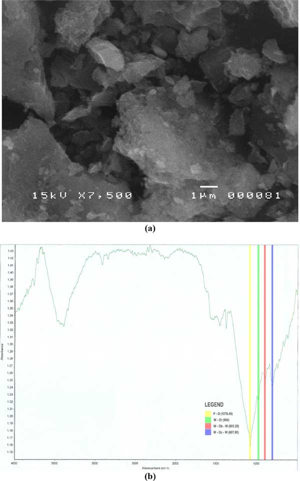 圖1:活性炭負載的磷鎢酸(a)x7500放大倍數(shù)的掃描電子顯微鏡圖像和(b)FTIR光譜。