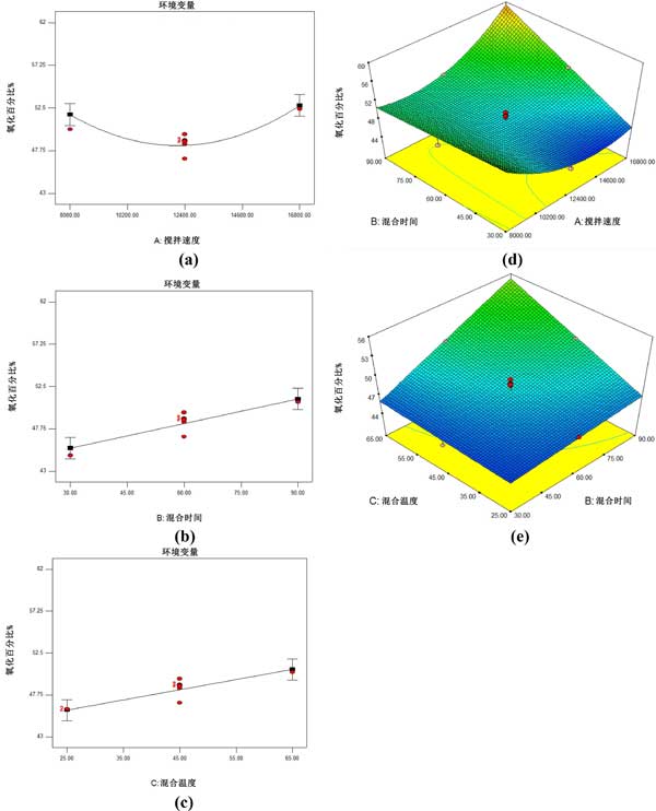 圖2:(a)混合速度、(b)混合時間和(c)混合溫度與活性炭催化氧化百分比相關(guān)的模型圖和(d)混合時間和混合速度和(e)相互作用的影響的3D模型圖。