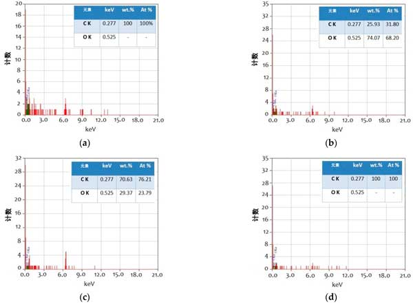 圖4:測(cè)試樣品在500倍放大率下的SEM磨痕圖像的EDX光譜(a)鋰基潤滑脂,(b)1wt.%活性炭,(c)2wt.%其他樣品,和(d)0.5wt.%活性炭+2wt.%其他樣品。