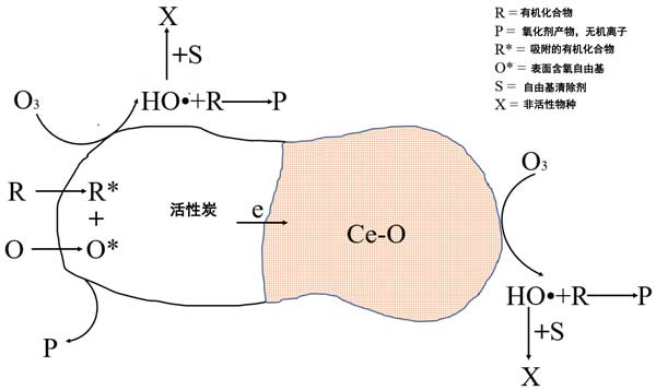 圖1:活性炭二氧化鈰催化的臭氧化過程中發(fā)生的主要反應途徑示意圖。
