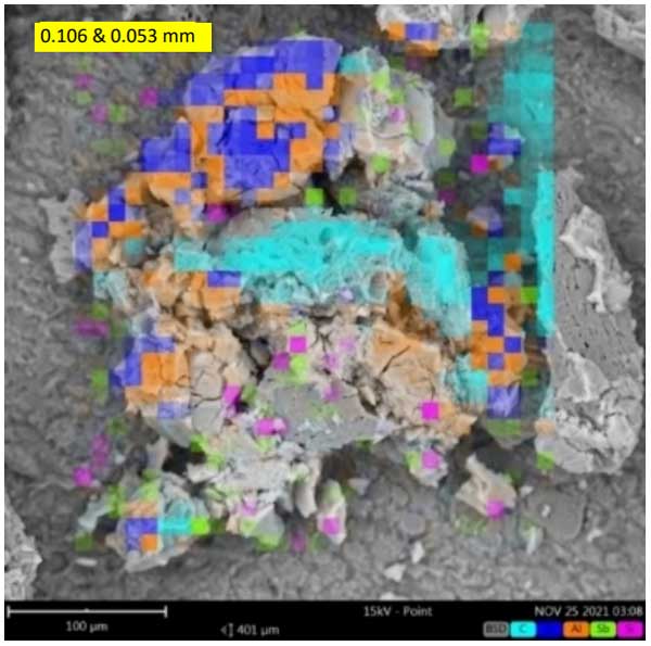 水性介質(zhì)最終溶液中的元素通過測定。溶液中存在的元素可以來自電極氧化、活性炭孔隙中的元素提取以及水介質(zhì)中使用的硬水中的元素。在測試中,由于電凝過程中的廣泛氧化,F(xiàn)e水平低于Fe量化限值(0.01mg/L)。使用0.106毫米大小的活性炭顆粒的電凝工藝在鋁電極上實現(xiàn)了比鐵電極更均勻的涂層,如750倍和600倍放大率下的活性炭顆粒的SEM圖像所示(見圖1);钚蕴拷Y(jié)果中存在的多元素在王水中消解并通過ICP-OES表征,通過電極的氧化、活性炭顆粒的凝聚和水介質(zhì)硬水中所含金屬的吸附而增加。