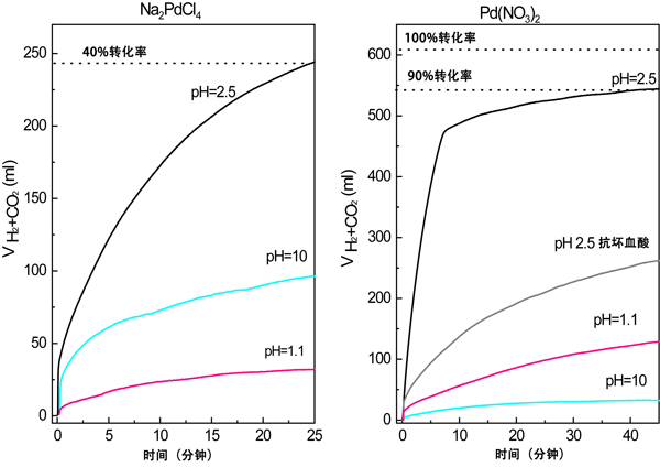 圖2:對于通過使用兩種Pd前體在不同的浸漬pH值下制備的活性炭催化劑,所產(chǎn)生的重整氣體(H2+CO2)的體積隨時(shí)間變化。