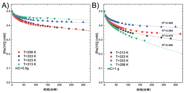 圖2顯示了溶液Re(VII)的初始濃度=0.5mM在不同溫度和活性炭量下的動(dòng)力學(xué)曲線。圖2A和B顯示了當(dāng)每200cm3溶液分別使用0.5和1g活性炭時(shí)的濃度變化。溶液中使用的活性炭量越大,Re(VII)濃度的降低越顯著。這種趨勢(shì)歸因于吸附劑的大比表面積,這導(dǎo)致了大容量。碳含量加倍使表面積加倍。