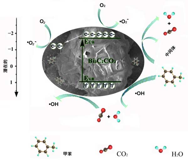 活性炭復(fù)合材料在光照射下降解氣態(tài)甲苯的光催化反應(yīng)機(jī)制可以解釋如下(圖4)。首先,蜂窩狀活性炭基質(zhì)吸附并捕獲甲苯分子。然后,在光照下,電子從價(jià)帶(VB)激發(fā)到負(fù)載Bi2O2CO3的活性炭表面的導(dǎo)帶(CB),在VB中留下空穴;钚蕴靠梢猿洚(dāng)電子受體以降低電子-空穴對的復(fù)合率。因此,Bi2O2CO3中CB上的激發(fā)電子可以很容易地轉(zhuǎn)移到活性炭表面,從而促進(jìn)光生電荷載流子的分離和遷移。