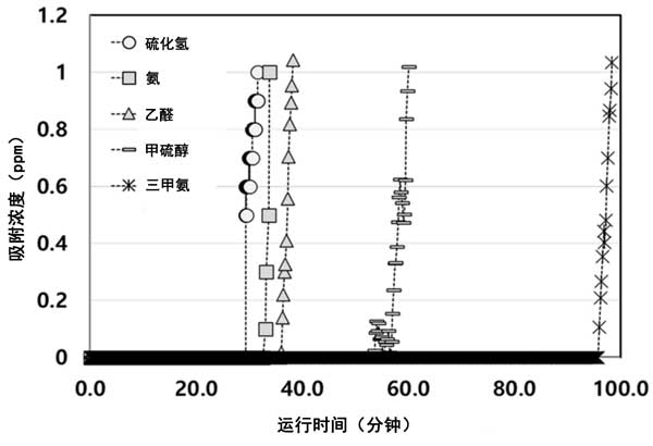 為了評估活性炭對不同廢氣的有效吸附量,應研究其吸附能力。廢氣的氣味閾值和刺激水平在十億分之一的水平。吸附劑的總吸附容量很難用作從廢物中去除廢氣的設(shè)備的設(shè)計因素。因此,我們根據(jù)突破點計算了小于1ppm的有效吸附量。突破柱實驗在304不銹鋼管式反應器中進行,總流量為1L/min,其中包含硫化氫(H2S)、氨(NH3)、乙醛(AA)、甲硫醇(MM)和三甲胺(TMA),如圖2所示。突破曲線依次為H2S、NH3、AA、MM、TMA。與廢氣相比,TMA具有更好的動態(tài)吸附性能,因為它具有更長的突破時間和相應的更大的有效吸附容量(<1ppm)。