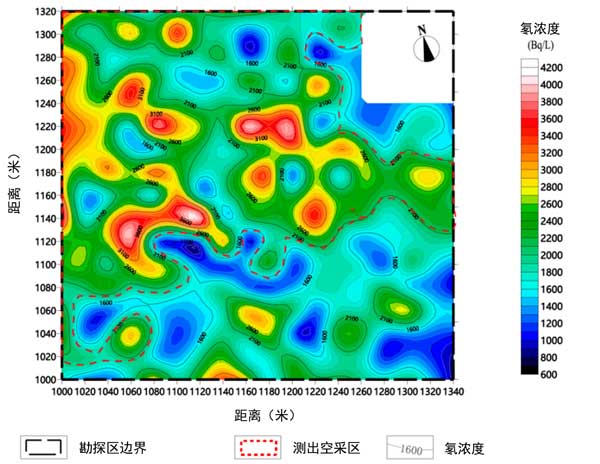 圖2:活性炭測(cè)量的氡值等高線平面和采空區(qū)異常解釋(紅色線框)圖。