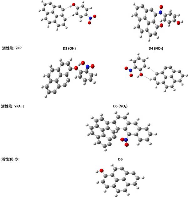 圖1:污染物和水與活性炭連接形成兩個(gè)分子聚集體的優(yōu)化結(jié)構(gòu)。