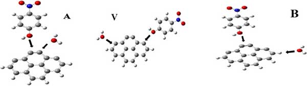 如上所述,為了啟動(dòng)對(duì)復(fù)合物優(yōu)化結(jié)構(gòu)的系統(tǒng)搜索,硝基苯酚和水分子均以選定的方向放置在距活性炭表面3Å的位置,覆蓋主體周?chē)恼麄(gè)物理空間。兩個(gè)分子被設(shè)計(jì)為從不同的相對(duì)方向相互接近:(1)兩者都從本體的同一側(cè)進(jìn)行攻擊(A-初始構(gòu)型),(2)攻擊來(lái)自本體的相對(duì)側(cè)(V-初始構(gòu)型),(3)兩個(gè)分子遵循垂直路徑(B-初始構(gòu)型)。這三種方法如圖2所示。選定的初始構(gòu)型AB區(qū)分通過(guò)化學(xué)吸附或通過(guò)物理吸附連接的復(fù)雜結(jié)構(gòu)的形成。配置A有利于物理吸附,而配置V和B分別有利于完全和部分化學(xué)吸附。