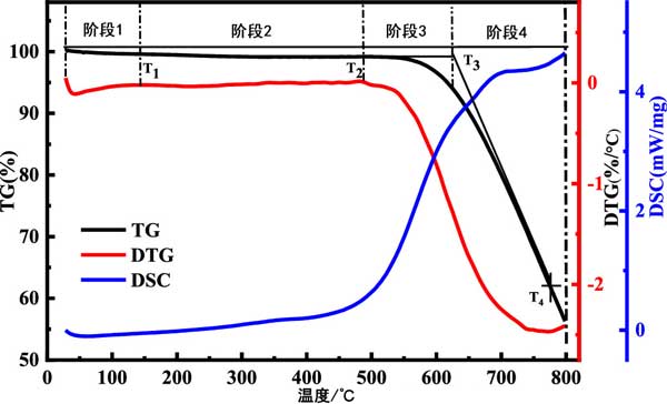 此后,樣品開始進入熱分解階段,范圍為T2至T3。在此階段,活性炭表面的一些含氧官能團和芳環(huán)等大量內(nèi)部結(jié)構(gòu)被破壞,質(zhì)量損失率逐漸增大。此外,DSC曲線的放熱速率繼續(xù)增加。