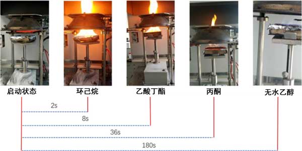 圖3顯示了四個樣品的初始燃燒火焰和點火時間?梢钥闯,四個樣本的點火時間按照環(huán)己烷<乙酸丁酯<丙酮<純無水乙醇的順序遞增。顯然,吸附VOCs后的樣品更易燃燒,其中環(huán)己烷樣品是最容易被點燃的一種。從火焰尺度來看,吸附樣品的火焰高度較大,燃燒強度較強。此外,純無水乙醇樣品的火焰顏色為淺藍色,表明純無水乙醇燃燒時樣品的表面溫度低于其他三個吸附樣品。