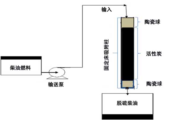 控制排放流量并且固定床吸附塔裝置中的流量保持恒定以達(dá)到穩(wěn)態(tài)條件。在接近穩(wěn)態(tài)條件時從固定床吸附塔裝置出口采集產(chǎn)品樣品并準(zhǔn)備用于硫含量分析。為了確認(rèn)脫硫?qū)嶒?yàn)結(jié)果的準(zhǔn)確性,每次運(yùn)行重復(fù)脫硫運(yùn)行兩次。運(yùn)行完成后關(guān)閉計(jì)量泵,并將所有打開的閥門設(shè)置為關(guān)閉。
