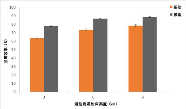 柴油和模型柴油用作油原料,以評估活性炭和改性活性炭的脫硫工藝。柴油初始硫濃度為7510ppm。兩種柴油原料用于固定床吸附塔裝置的脫硫工藝。為了進(jìn)行脫硫?qū)嶒?yàn),使用計(jì)量泵將油原料送入塔中。采用垂直向下固定床吸附塔裝置連續(xù)吸附硫化合物,流量為1mLs-1。柱子逐漸裝載不同高度的活性炭層(3-9厘米),對應(yīng)于不同的活性炭重量(10、7和4克)。