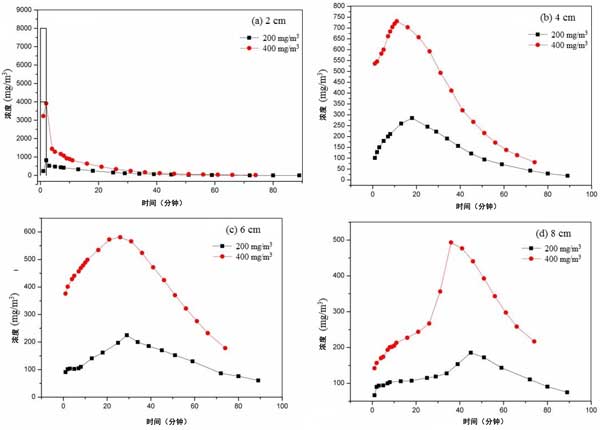 選擇平衡吸附濃度為200和400mg/m3的活性炭。截面風速設定為0.3m/s。乙醇的脈沖濃度是原始平衡濃度的20倍。脈沖時間為2分鐘。不同活性炭床層高度、不同平衡吸附濃度下脈沖后出口濃度變化曲線如圖3所示。