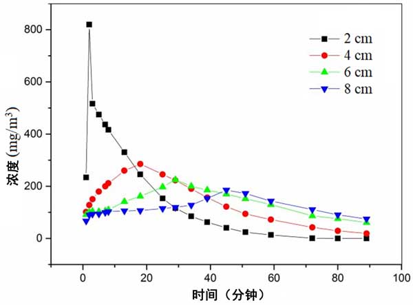 乙醇作為吸附物。截面風速設定為0.3m/s。飽和吸附濃度為200mg/m3。脈沖時間為2分鐘。脈沖倍數(shù)為20倍。通氣方式為正壓通氣。不同高度出口濃度隨時間變化曲線如圖4所示。