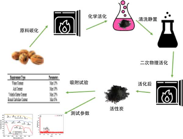 果殼用作生產(chǎn)活性炭的原料。在果殼廢料的合成過程中,第一步是將殼在陽光下干燥3小時(shí)。然后將干燥的果殼在350℃的溫度下碳化2小時(shí)。隨后使用研缽將碳化的果殼研磨成粉末,然后過100目篩。樣品制備首先稱量肉豆蔻殼粉末和預(yù)定的1M-HCl溶液。接下來,用1M-HCl溶液將粉末活化24小時(shí)。活化后,活性炭過濾并用蒸餾水洗滌,直至pH值變?yōu)橹行。一旦pH值為中性,活性炭就會在110℃的溫度下煅燒1小時(shí)。煅燒后,來自肉豆蔻殼的碳在惰性氣體氣氛(氮?dú)?中在600℃、650℃和700℃的溫度下退火2小時(shí)。然后用蒸餾水洗滌所得結(jié)果以除去金屬化合物。氨(NH3)水平降低最多的樣品將根據(jù)下面的圖1進(jìn)行表征。