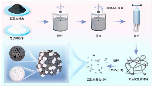 活性炭之所以特別適合用于吸附過程,是因為它具有高度多孔的無定形結(jié)構(gòu),能夠吸附各種分子。它具有微孔和中孔,可以容納各種大小的分子,補(bǔ)充了分子篩的孔隙特異性;钚蕴窟具有利用功能基團(tuán)改變其表面化學(xué)性質(zhì)的潛力,從而增強(qiáng)其與目標(biāo)分子的相互作用。本文以羧甲基纖維素為黏合劑,通過機(jī)械混合和擠出法制備了一系列 華活性炭分子篩復(fù)合材料(圖1)。