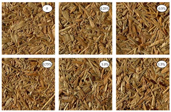 在UF樹(shù)脂中添加活性炭還可以改善刨花板的各種機(jī)械性能。研究表明,活性炭可以提高板材的尺寸穩(wěn)定性、強(qiáng)度和防水性。這在擔(dān)心潮濕暴露的應(yīng)用中尤其有益。所生產(chǎn)的刨花板的外觀如圖2所示。添加高達(dá)1.5%活性炭沒(méi)有觀察到任何影響。相反,在碳含量較高的情況下,所得板材變暗并變灰。因此,在不影響材料美觀的情況下,這可以被視為較小負(fù)載的優(yōu)勢(shì)。