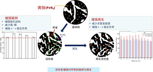 固有黃鐵礦的存在為提升活性炭的吸附和再生能力提供了一種經(jīng)濟(jì)高效的手段,這對(duì)于開(kāi)發(fā)高性能、可重復(fù)使用的甲苯吸附劑具有重要意義。同時(shí),黃鐵礦轉(zhuǎn)化而來(lái)的Fe₃O₄在熱再生過(guò)程中起催化作用,有助于恢復(fù)活性位點(diǎn)和維持微孔結(jié)構(gòu),確保活性炭性能的一致性。